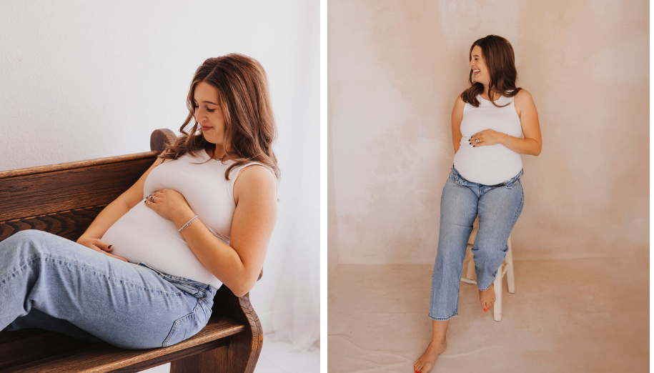 One of the reasons Morgan loves photographing at Little White Photo Studio is the way it instantly feels welcoming. The studio’s soft atmosphere-bright natural light, clean tones, and versatile furnishings-makes it easy for expecting mothers to relax and simply be.